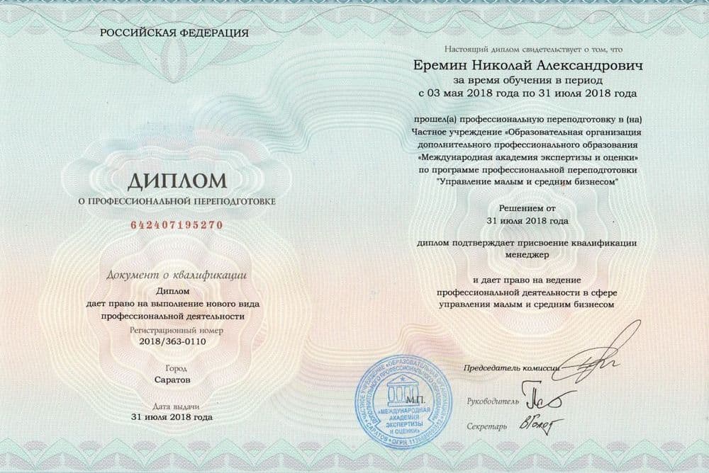 В результате обучения Вы получаете диплом о профессиональной переподготовке